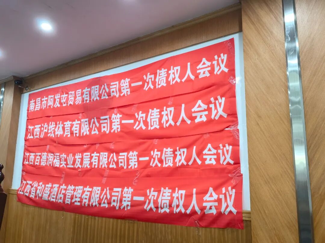 南昌市阿发屯贸易有限公司、江西沪线体育有限公司、江西省和盛酒店管理有限公司、江西百德润福实业发展有限公司因资不抵债,进入破产程序。江西省南昌市中级人民法院于2022年6月30日作出相关民事裁定书,裁定受理上述公司破产清算,2022年7月13日作出决定书,指定北京市京师(南昌)律师事务所担任管理人。