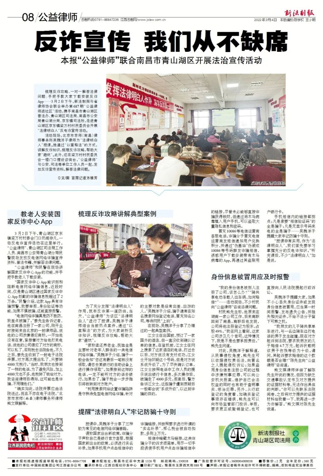 梳理反诈攻略、一对一解答法律问题;手把手教大家下载安装反诈App……3月2日下午,京师南昌律师事务所熊文琪律师、吴魏洋子律师受邀参加由新法制报与省律师协会联合举办推出的“公益律师进社区”活动,携手南昌市青山湖区普法办、青山湖区司法局、南昌市公安局青山湖分局、京东镇司法所,走进青山湖区京东镇梁万村村民委员会开展“法律明白人”反电诈宣传活动。