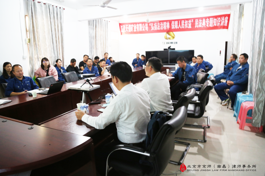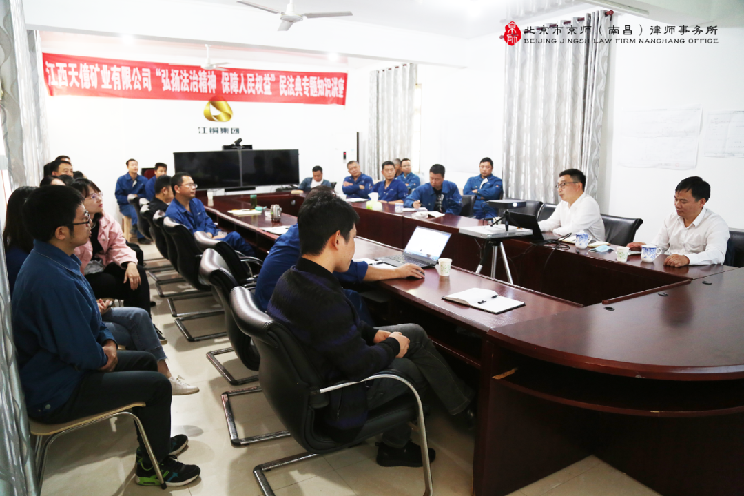 为深入贯彻落实习近平总书记关于切实实施民法典的重要讲话精神,进一步增强单位员工法制观念,提升法律知识水平,进一步推进民法典有效执行。2020年9月25日,江西天億矿业有限公司组织开展了“民法典进矿区”主题讲座培训活动,我所主任律师王隆彬、肖必想受邀前往单位矿区现场,为矿区全体员工授课。 主讲人:王隆彬(左)、肖必想(右) 本次讲座,王隆彬主任律师围绕民法典的体系,对总则编创新内容、物权编创新内容、合同三分编、人格权编、婚姻家庭编、继承编和侵权责任编等七大板块进行了详细阐述,就民法典各编中的“亮点”结合有关案例进行了深入浅出的解读。肖必想主任律师结合顾问单位性质及业务特点,详细解读了民法典中建设工程合同章节有关规定的历史沿革和发展,并对于其中重点条款及有关概念结合实际案例深入进行讲解。讲座最后,两位主任律师对单位员工们提出的问题,结合民法典内容进行了回答。 图:讲座现场 北京市京师(南昌)律师事务所始终坚持从内、外两个方面,撰写专业文章、进行内部培训和客户培训,开展线上直播等多个角度对《民法典》进行了学习,对《民法典》热点问题进行了解读,始终保持行业新锐思维。今后,北京市京师(南昌)律师事务所将继续加强对《民法典》的学习,提高应用能力以为客户提供更高品质的服务,也为建设法治社会作出积极贡献。