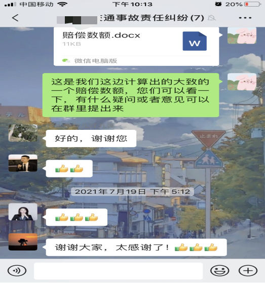 起初,我和钟女士家属通过微信群聊沟通,询问一些事项,如钟女士因交通事故去世后家里有没有子女或老人需要她抚养之类的问题。家属们态度都很好,我提出的问题他们也会一一回应。于是乎,我在他们告诉我的信息的基础上计算出了本案的人身损害赔偿额,为他们第二天和保险公司谈判提供了依据。钟女士的女儿还主动添加了我的微信,并通过微信电话向我具体了解赔偿额的构成和计算方式。接电话前,其实我是很忐忑不安的,我怕家属突然问出一些我也不太明白的问题。但和钟女士女儿实际通电话时,我还是尽我所能向她解释赔偿额是依据什么计算出来的,并自然地回答了她问我的一些法律问题。通话即将结束时,她向我表示了感谢,我的心里陡然萌生出一股快乐感和自豪感,我用我所学的法律帮助了他人,解决了他们所面临的法律问题。这一刻,我也真真正正地体会到了法律落地了,它不再是书本上的理论知识,它化身成了解决实际问题的帮手。我也不禁回想起制作赔偿数额清单时,毛崽哥对我说的“法律是用来解决问题的,你这份清单呢,一定要写得清楚明白,让当事人一看便知道是什么情况,他们该怎么依照清单去和对方谈判”。确实如此,当事人寻求法律的帮助,目的便是解决自己所面临的问题。而我们作为法律人,要做的便是把书本上的法律灵活地运用到实际案件中,帮助当事人解决实际问题。
