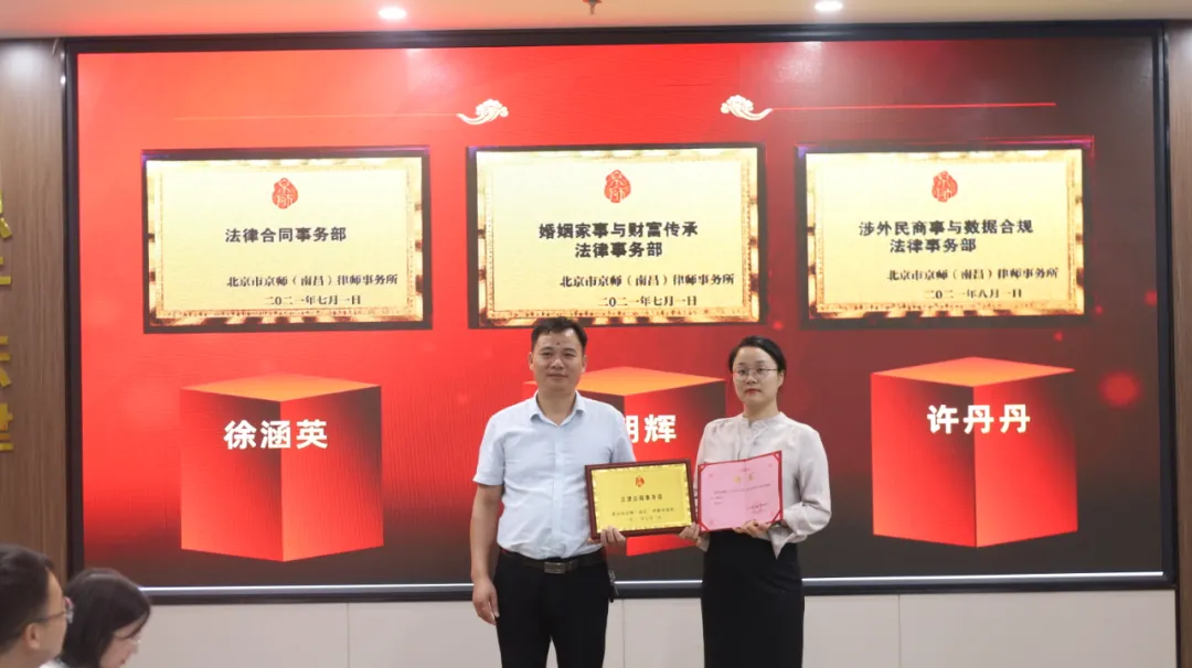会议伊始,管委会副主任肖必想律师,夏玲虎律师分别为新晋的婚姻家事与财富传承事务部主任余期辉律师、法律合同事务部主任徐涵英律师、涉外民商事与数据合规法律事务部主任许丹丹律师颁发了部门主任证书及部门牌匾。
