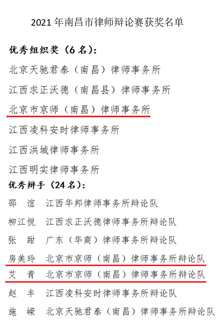 2021年9月18日,由南昌市律师协会主办的南昌律师辩论赛决赛在南昌江报传媒大厦落下帷幕。此次辩论赛有来自全市律师行业各律所事务所组成的28支辩论队伍参加,我所主任律师彭云舟领队,带领我所律师房美玲、艾青和王雪薇组成的辩论队参加比赛。经过初赛、复赛、决赛三轮共26场激烈的角逐,最终为我所斩获优秀组织奖,房美玲和艾青也荣获优秀辩手奖。