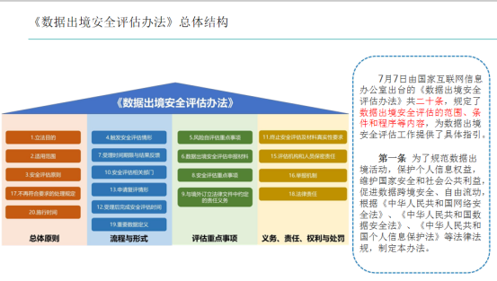 随着《中华人民共和国网络安全法》、《中华人民共和国数据安全法》、《中华人民共和国个人信息保护法》陆续出台,国际经济贸易互联互通的不断深入,数据出境的安全性问题成为与国家安全紧密相关的重大问题。2022 年 9 月 1 日又由中央网信办出台针对数据跨境管理规定,《数据出境安全评估办法》要求企业在境内产生的基础数据跨境的几种场景,须在 2023 年 3 月之前进行自行评估风险且出具相应报告进行备案。日前,京师上海所已与国家网信办指定公司签署了战略合作框架协议。