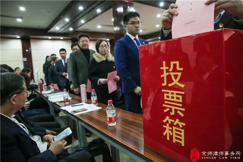 大会由律所党总支书记宋晓江同志主持,在雄壮的国歌声中拉开序幕。全体与会党员听取并审议通过了《中共北京市京师律师事务所总支部委员会工作报告》。朝阳区律师行业党委委员、区律协副会长蔡春雷同志宣读了朝阳区委《关于成立北京市京师律师事务所党委请示的批复》。总支副书记郑小宁宣读了《选举办法(草案)》,介绍了党委委员候选人建议人选的基本情况,宣读了监票人总监票人建议名单。会议以举手表决的方式通过了《选举办法》、候选人建议名单和监票人总监票人建议名单。在总监票人的主持下,到会有选举权的党员以无记名投票、差额选举的方式选举产生了中共北京市京师律师事务所委员会。