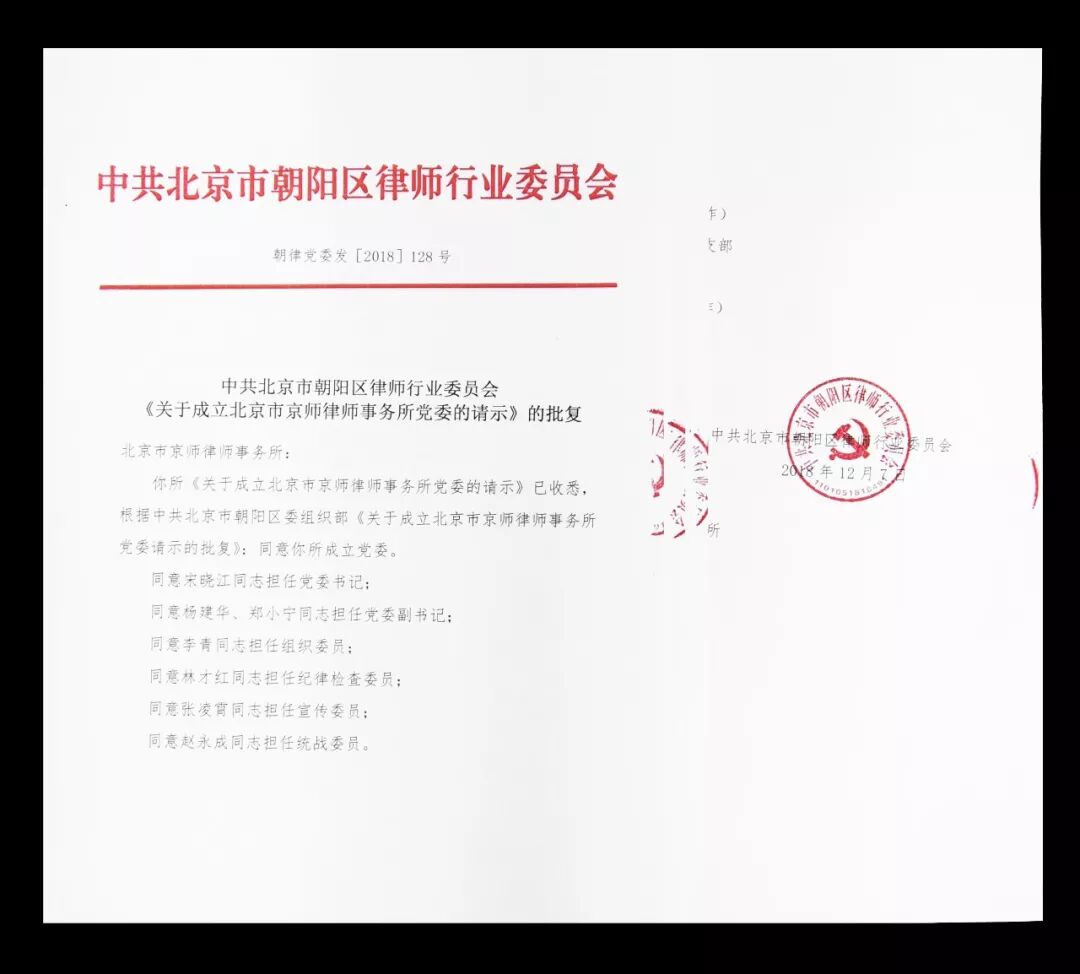 2018年12月7日,区律师行业党委正式批复北京市京师律师事务所党委成立,京师党建工作开启新的征程。