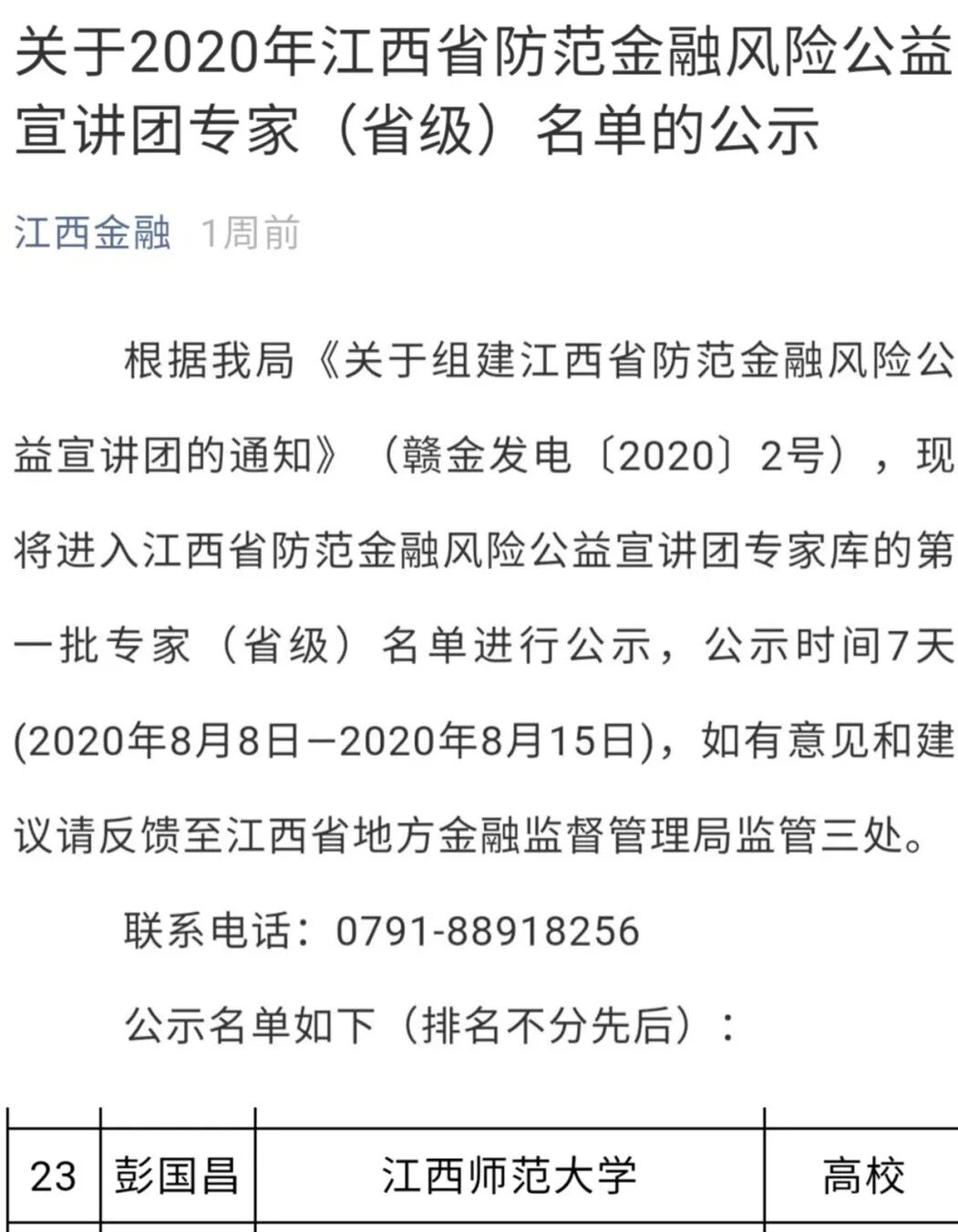 为深入贯彻党中央关于打好防范化解重大风险攻坚战的决策部署和《江西省人民政府关于进一步做好防范和处置非法集资工作的实施意见》(赣府发〔2016〕4号)精神,进一步巩固扩大防范化解重大金融风险的社会基础,提升宣传教育的系统性、针对性、有效性,从源头上遏制非法集资等非法金融活动高发态势,江西省政府金融工作办公室(省金融监管局)决定在全省范围内组建防范金融风险公益宣讲团。经过多轮推荐筛选,我所兼职律师彭国昌入选2020年江西省防范金融风险宣讲团(省级)专家。